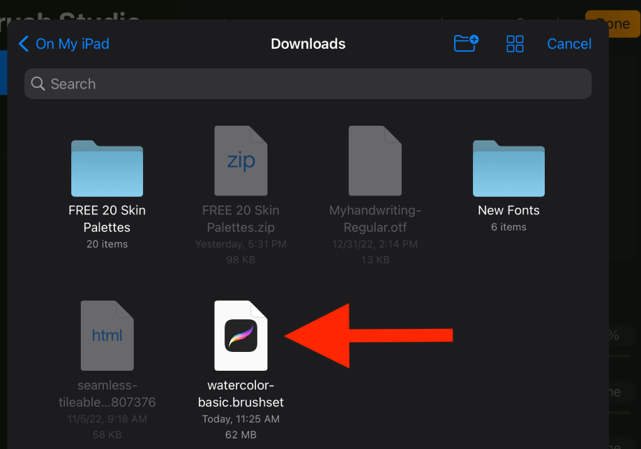 3. Adım:Cihaz dosyalarınızdan, yeni fırça seti dosya adınıza dokunun ve içe aktarmasını bekleyin, bu sadece birkaç saniye sürmelidir.
