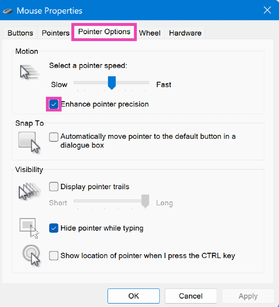 4. Adım:Yandaki kutuyu işaretleyinİşaretçi hassasiyetini geliştirin.