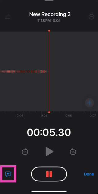 Sesli not uygulamasındaki kayıt düğmesine basın, genişletmek için panelde yukarı kaydırın ve canlı transkripsiyonu görüntülemek için Quotes simgesine basın.