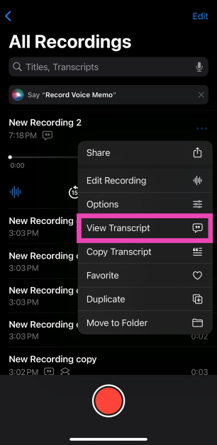 İPhone'unuzdaki Voice Memos uygulamasını kullanarak bir ses kaydı oluşturun, ardından kaydı seçin ve Ellips'e basın. Seçenekler listesinden 'Transcript'i Görüntüle'yi seçin.