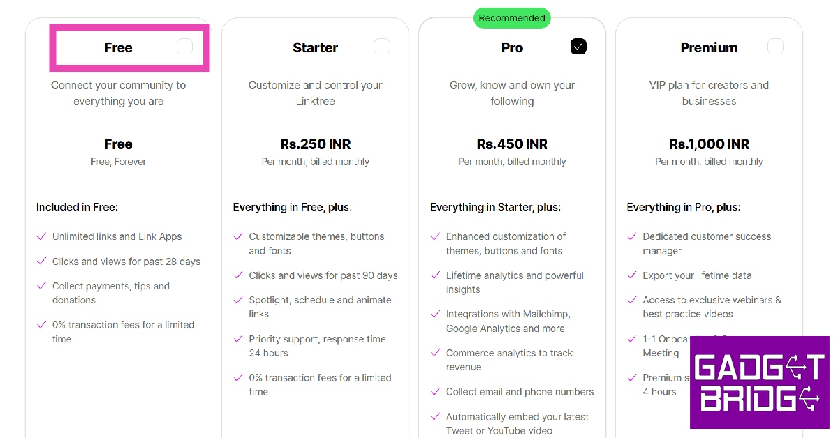 4. Adım:Seçinabonelik planı. Yalnızca tüm bağlantılarınız için bir açılış sayfası oluşturmakla ilgileniyorsanız, bir abonelik planına ihtiyacınız yoktur. Web sitesi bu hizmeti sunuyorücretsiz.