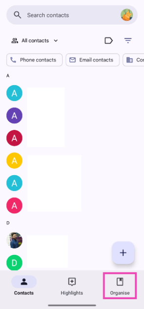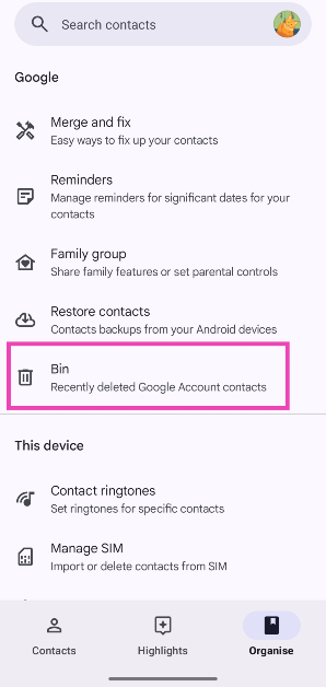 Google kişilerindeki geri dönüşüm kutusu 'Organize' sekmesindedir.