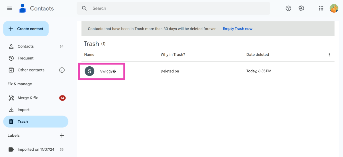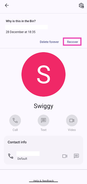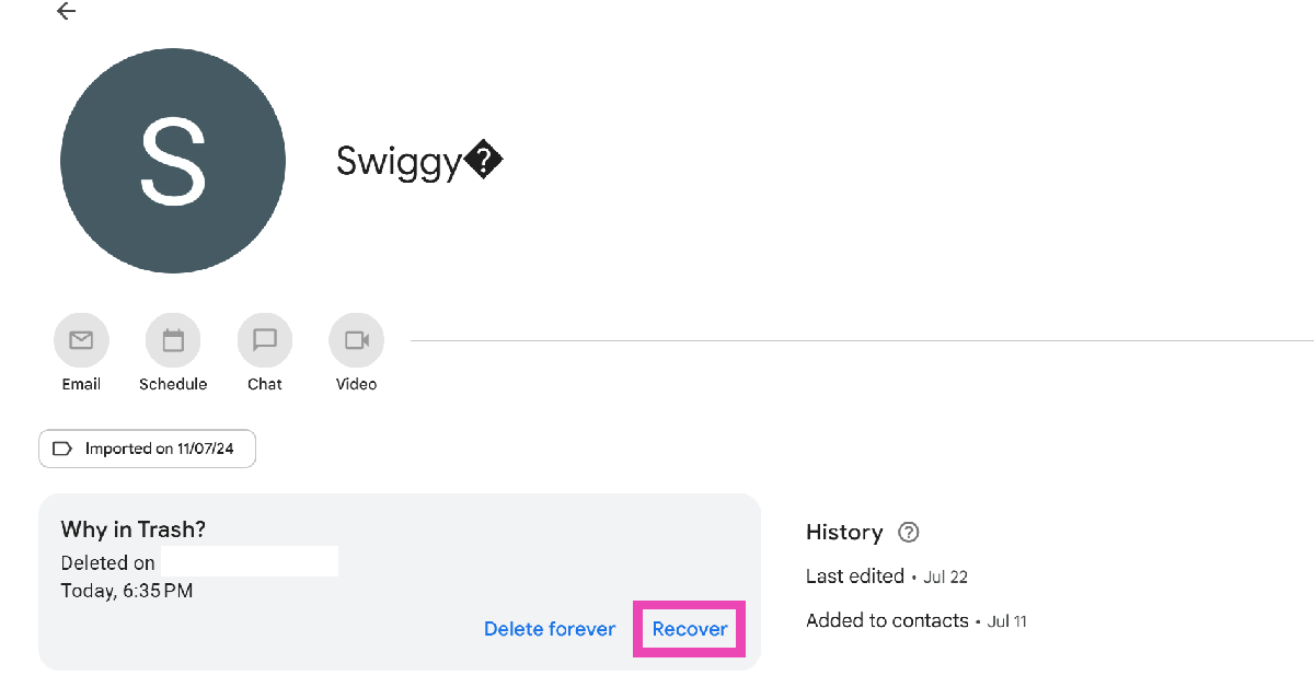 PC'nizdeki Google Kişiler Web Portalını açın, 'Çöp' üzerine dokunun, bir kişi seçin ve 'kurtar' tuşuna basın.