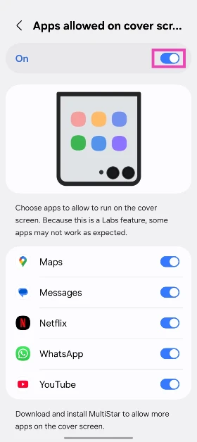 Samsung, flip'in kapak ekranında uygulamaları çalıştırmak için yerel bir seçenek sunar. Bununla birlikte, gelişmiş ayarlarda 'Labs' bölümüne sıkıştığı için bulmak biraz zor. Bu özelliği açtıktan sonra, kapak ekranındaki bir avuç uygulamaya erişebilirsiniz. Bunlar haritalar, mesajlar, Netflix, WhatsApp, YouTube ve daha fazlasını içerir.