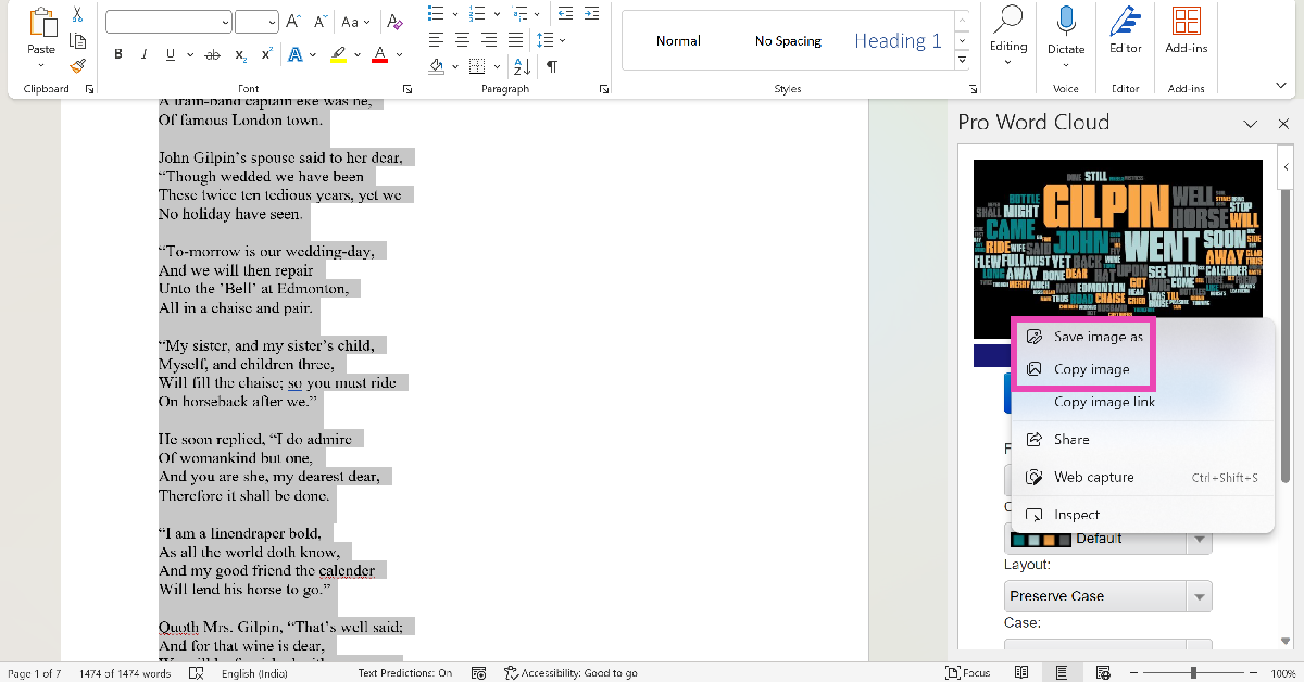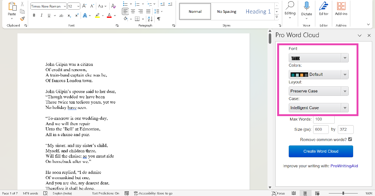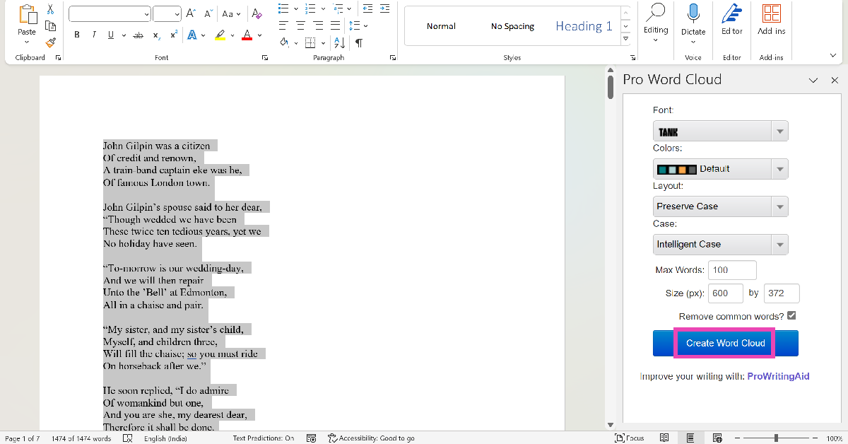 Ana Sayfa sekmesindeki eklentileri tıklayın ve Pro Word Bulut aracını seçin. Belgedeki metni vurgulayın ve Word Cloud Create Create.