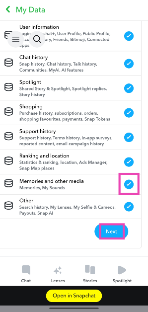4. Adım:Yandaki geçiş anahtarını açınAnılarınızı, sohbet medyanızı ve paylaşılan hikayelerinizi ihraç edin. Başka öğeleri dışa aktarmak istemiyorsanız, geçiş anahtarlarını kapatın.