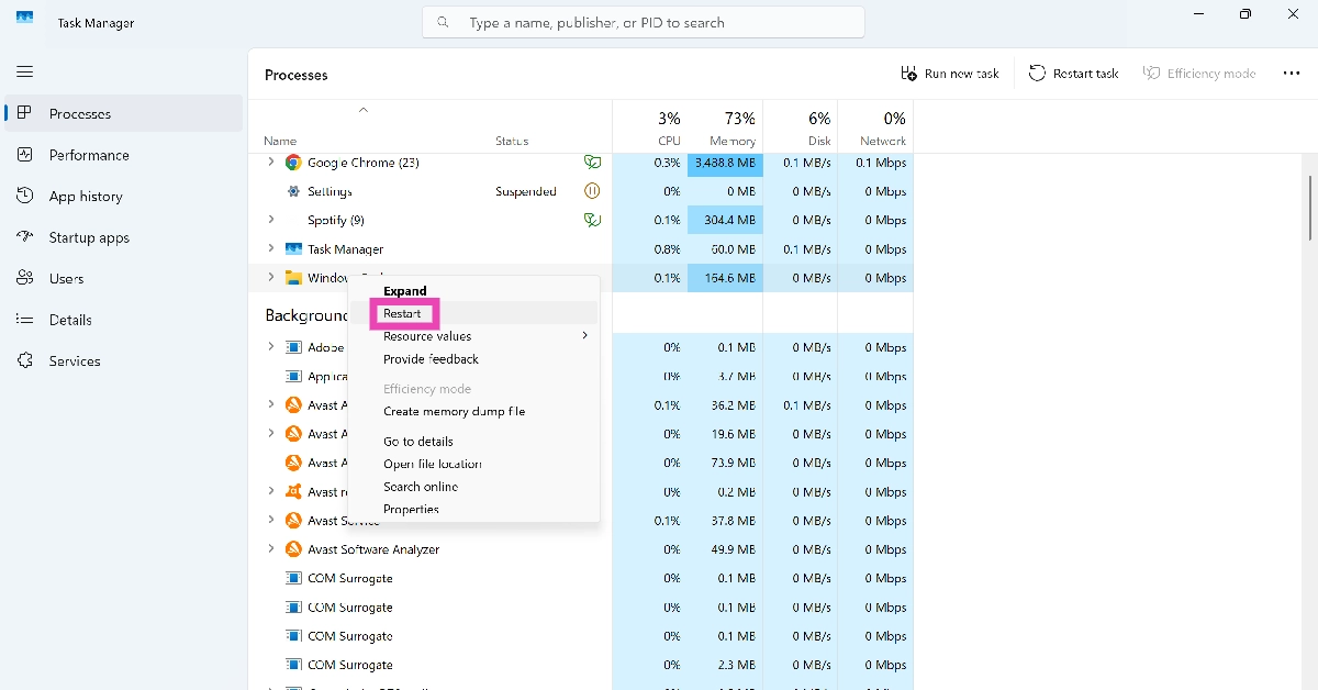 3. Adım:Sağ tıklayınWindows Gezginive seçTekrar başlat.