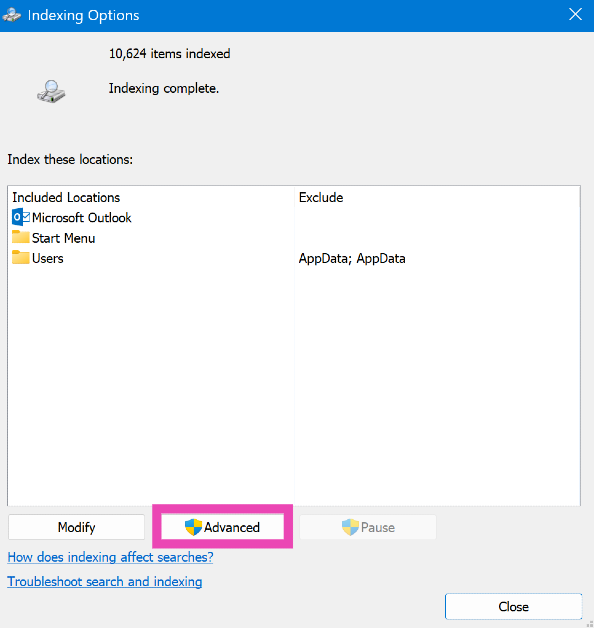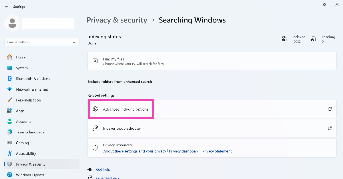 3. Adım:Aşağı kaydırın ve seçinGelişmiş dizinleme seçenekleri.