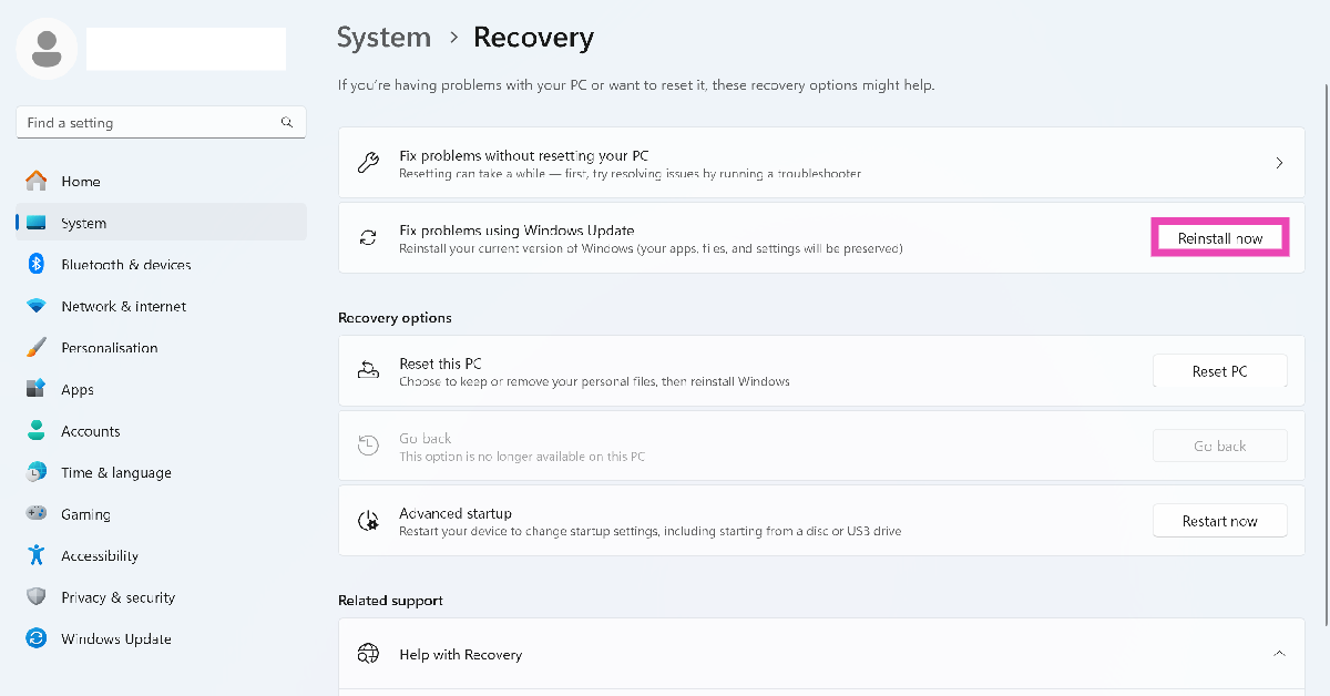 Gidip gelmekAyarlar> Sistem> Kurtarmave 'Windows Update'i kullanarak sorunları düzelt' yanındaki 'Şimdi Yeniden Yükle' 'yi tıklayın.