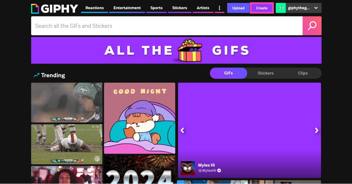 1. Adım:PC'nizde web tarayıcısını başlatın vehttps://giphy.com/. Hesabınıza giriş yapın. Eğer bir tane yoksa, bir hesap oluşturun.
