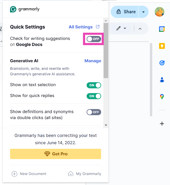 Uzantılar simgesine basın, dilbilgisine tıklayın ve '[Mevcut Web Sitesi] hakkında önerileri kontrol edin' 'nin yanındaki geçiş anahtarını açın.