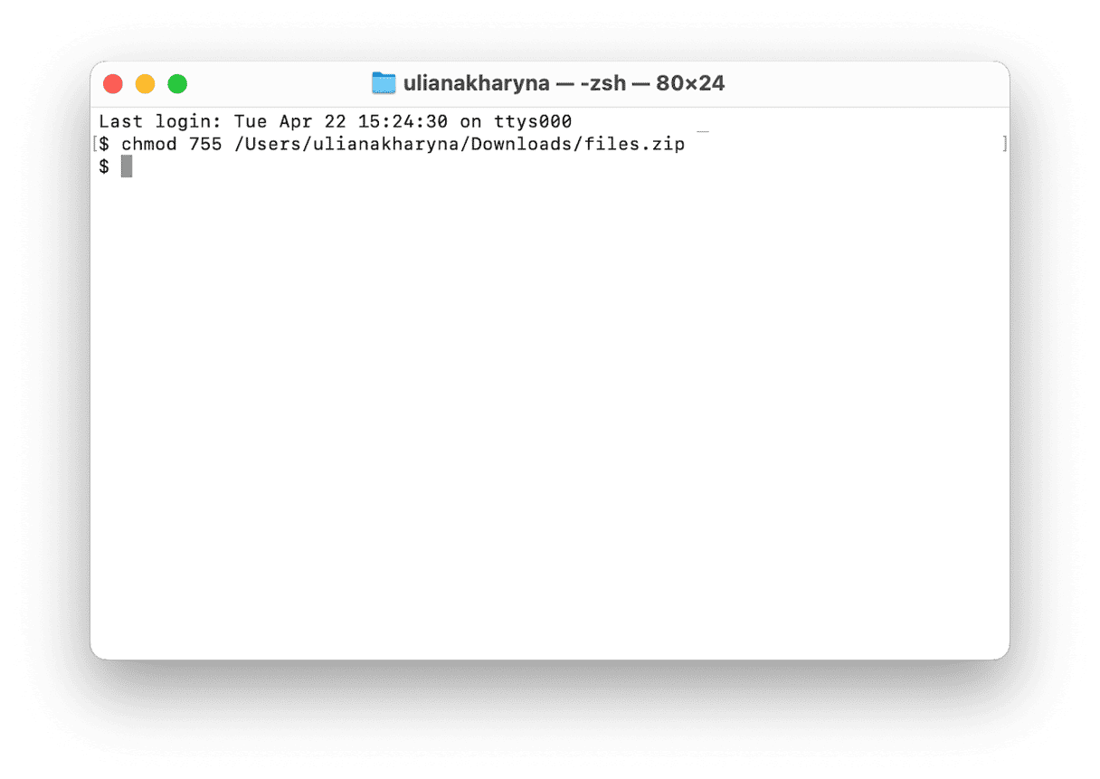 chmod 755- Bu aşamada dönüşe basmayın. - Zip dosyasını terminal penceresine sürükleyin ve bırakın.