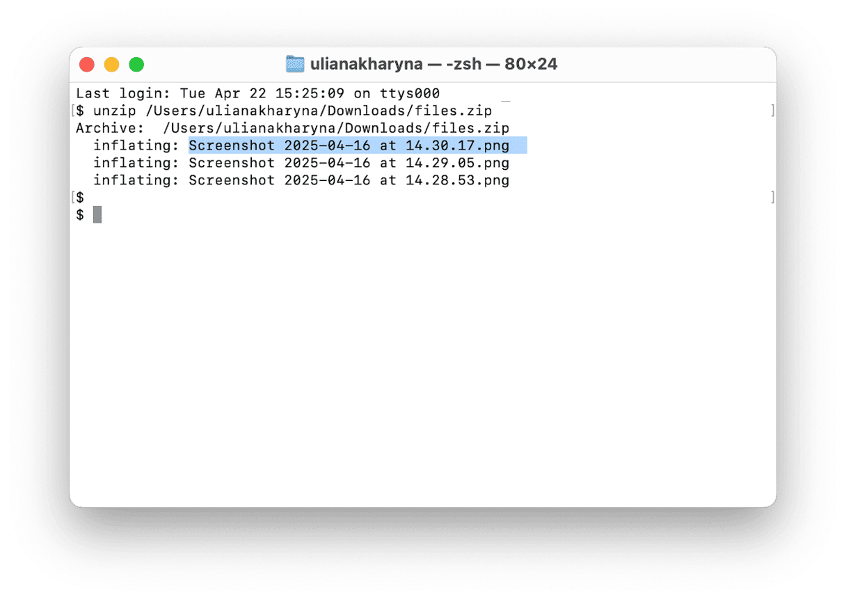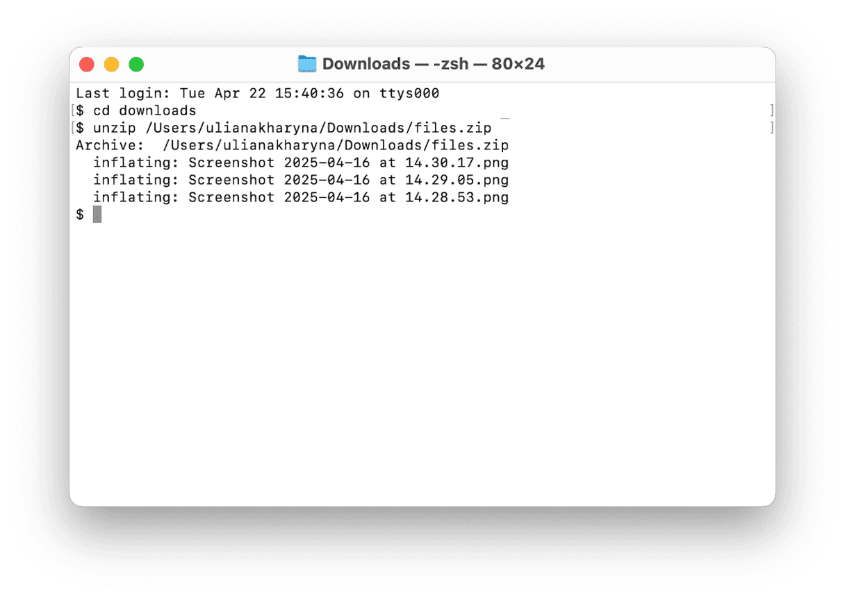 unzip - Zip arşivini terminal penceresine sürükleyin ve dönüş tuşuna basın.