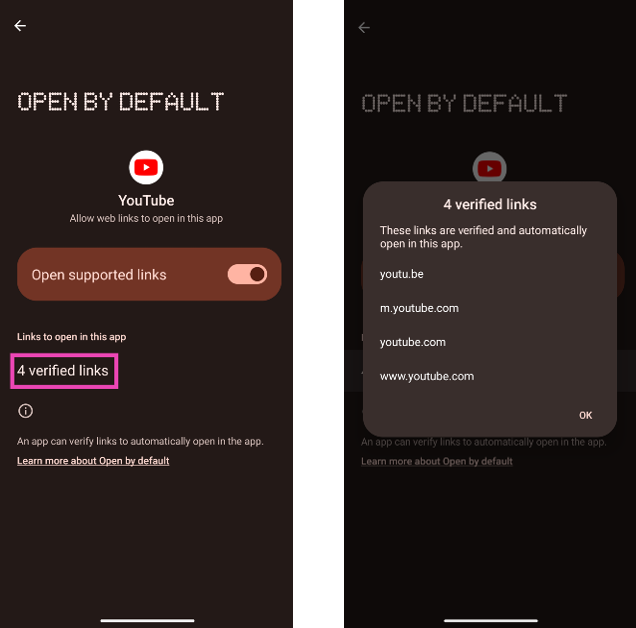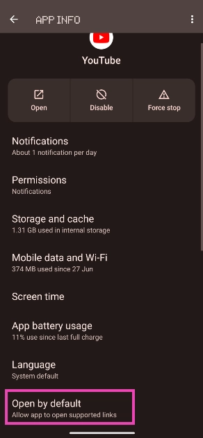 WhatsApp'ta YouTube bağlantılarını açamıyorsanız, bunları web tarayıcısına yüklemeyi deneyin. Gidip gelmekAyarlar> Uygulamalar> YouTube> Varsayılan olarak ayarlanmışve geçiş çubuğunu 'Desteklenen bağlantıları açın' kapatın.