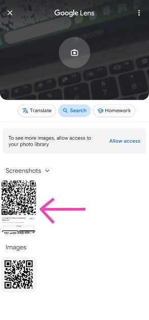 Telefonunuzun galerisinde saklanan bir QR kodu taramak için Google fotoğraflarında açın ve ekranın altındaki lens seçeneğine basın.