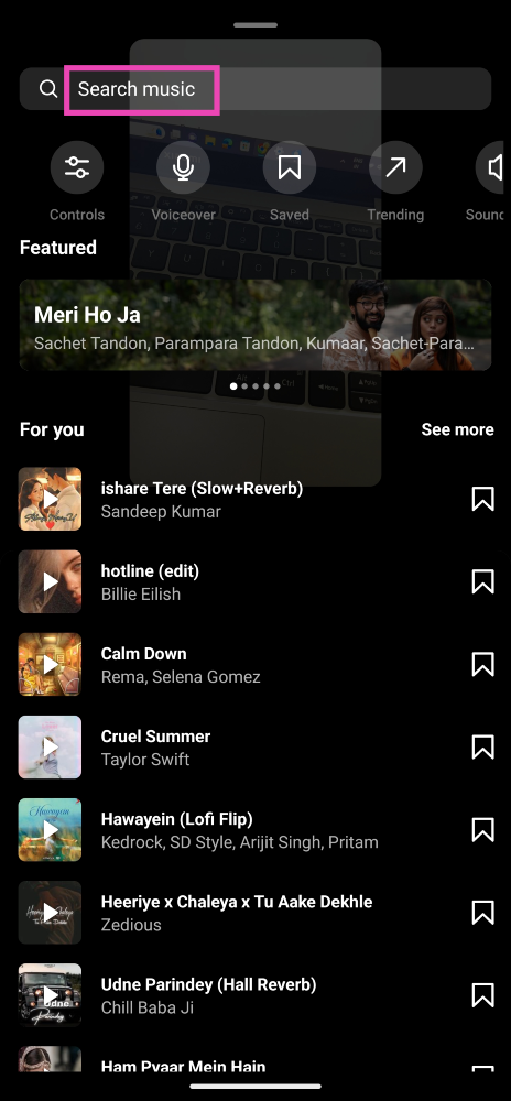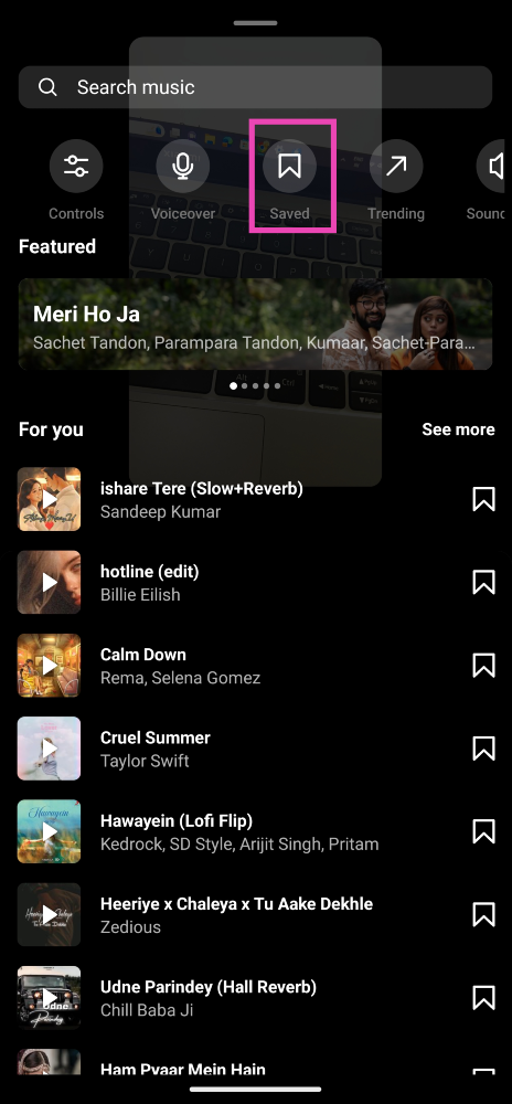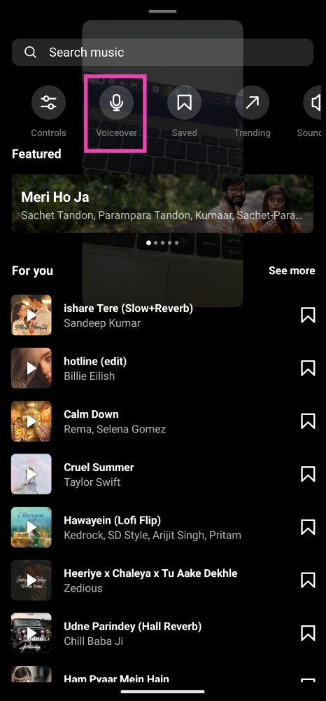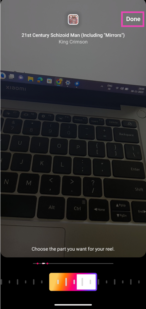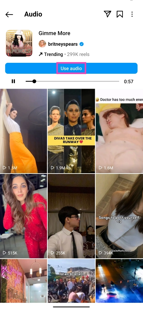 Bir makara çektikten sonra, düzenleme sayfasındaki Müzik Notu simgesine basın, trend üzerine dokunun ve bir şarkı seçin. Bir sonraki sayfada, makaranız için arka plan müziği olarak istediğiniz şarkının bölümünü seçmek için kaydırıcıyı kullanın. VurmakTamamlamakSonuçtan memnun kaldığınızda.