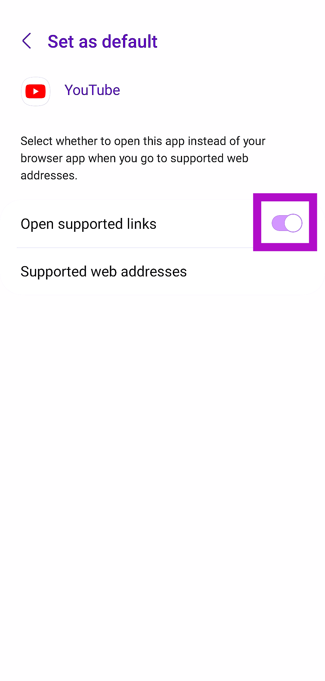 YouTube uygulaması için varsayılan ayar olarak 'Desteklenen Bağlantıları Aç' ayarlayın