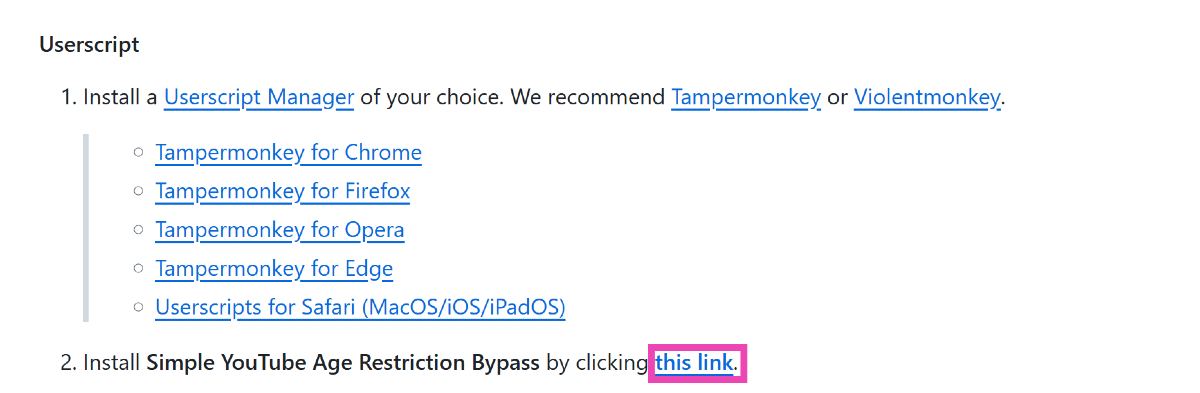 2. Adım:GitBasit YouTube Yaş Kısıtlama Bypass sayfasıGithub'da ve aşağı kaydırınUsercript bölümü.