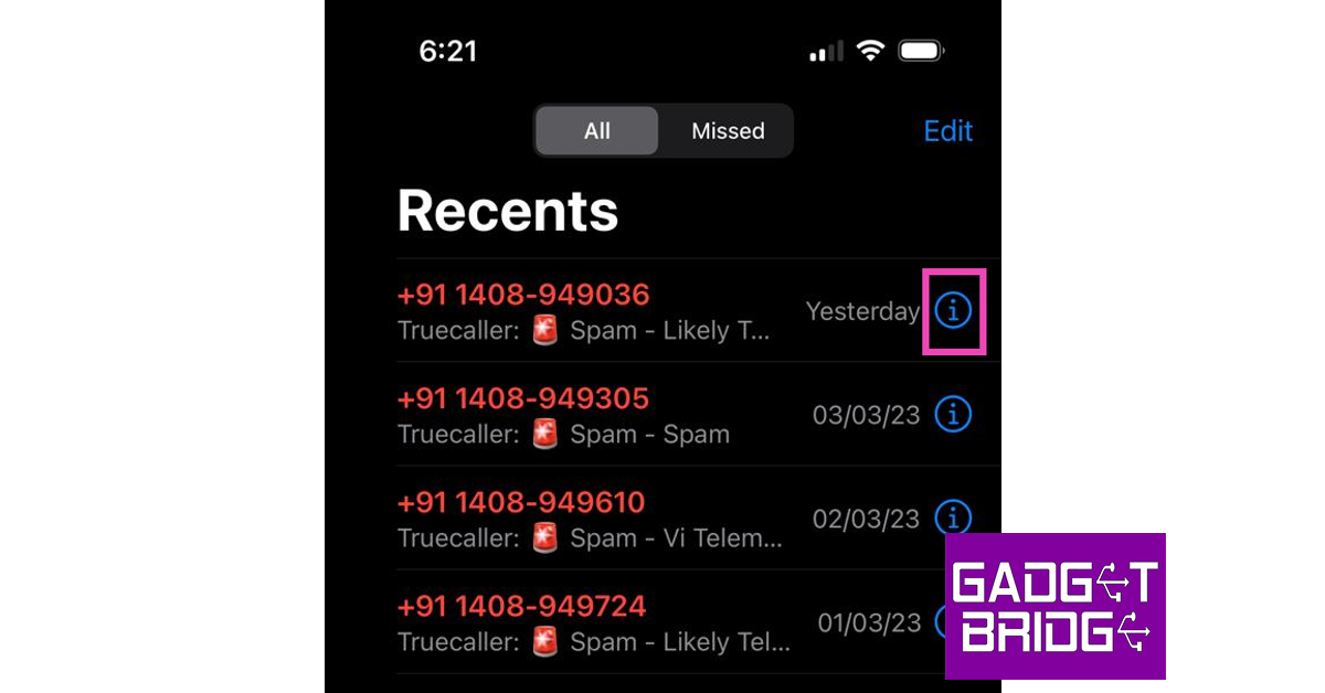 2. Adım:Engellemek istediğiniz telefon numarasının yanındaki bilgi simgesine dokunun.