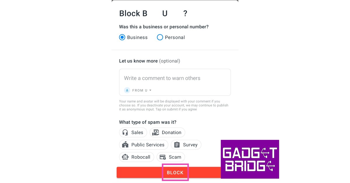 4. Adım:Aşağıdaki açılır kutuda,TruecalerKişinin kişisel veya işletme hesabı olup olmadığını soracaktır. Ayrıca, isteğe bağlı olan engelleme için bir neden talep edecektir. Gerekli seçimleri yapın ve blok vurun.