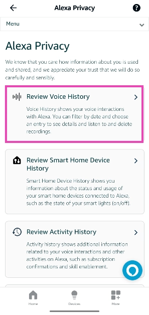 Amazon Alexa uygulamasını başlatın veDaha fazla> Alexa Gizliliği> Ses geçmişini gözden geçirin.