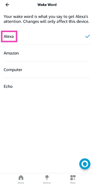 Telefonunuzdan Amazon Alexa uygulamasına gidin ve seçinCihaz> Ayarlar> Wake Word. Tercih ettiğiniz uyandırma kelimesini seçin ve geri dönün.