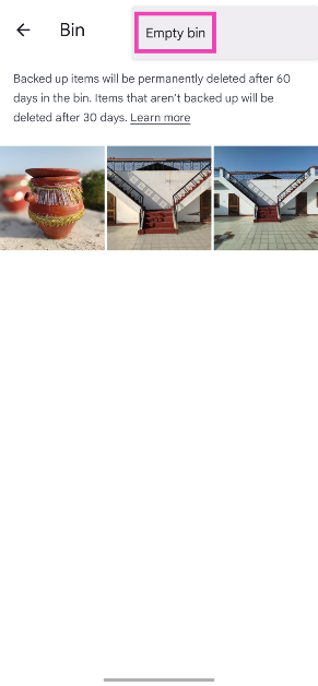 Google fotoğraflarını kullanarak bir görüntüyü silerseniz, yalnızca o uygulamanın binasında erişilebilir. Yerel galeri uygulamanızın çöp klasöründe bulamazsınız. Bu aynı zamanda ters senaryoda da geçerlidir. Geri dönüşüm kutusuna aktarılan dosyalar, kalıcı olarak silinmeden önce 30 gün boyunca orada kalır.