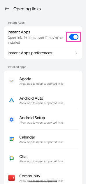 Gidip gelmekAyarlar> Uygulamalar> Varsayılan Uygulamalar> Bağlantıları Açmave anlık uygulamalar için geçiş anahtarını kapatın.