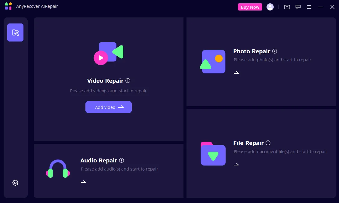 - 1. Adım:AnyRecover Airepair'i açın ve ana ekranda Dosya Onarımı'nı tıklayın. Bu, bozuk dosyaları alabileceğiniz bir dosya tarayıcısına erişecektir. Parti onarımı için farklı formatlarda birden fazla dosya girebilirsiniz.