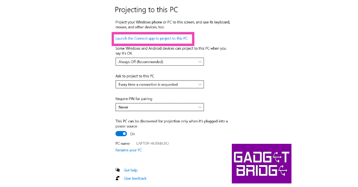 4. Adım:'Bu PC'ye projelendirmek için Connect uygulamasını başlatın' seçeneğini seçin.