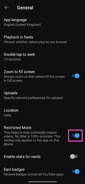 4. Adım:Aşağı kaydırın ve geçiş anahtarını kapatınKısıtlı mod.