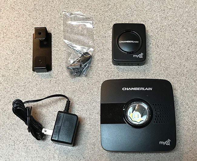 MYQ garajını satın aldıktan sonra kutuyu açın. Aşağıdaki resimde gösterilen öğeleri almalısınız. Wi-Fi merkezinin arkasındaki bir etikette bulunan seri numarasını not ettiğinizden emin olun.