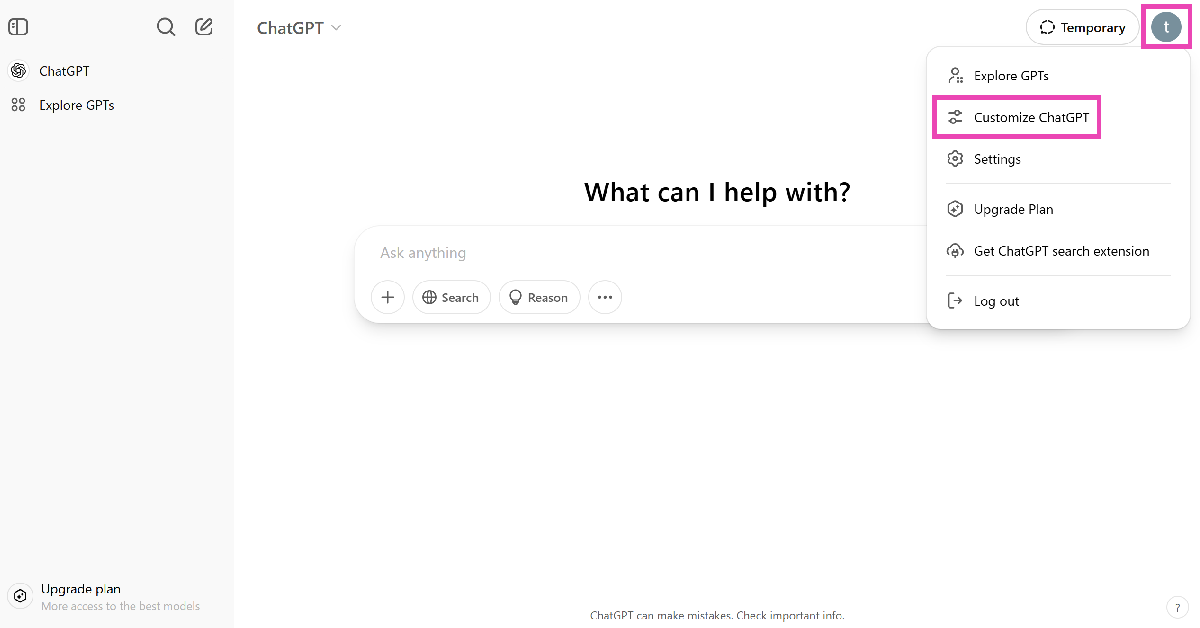 2. Adım:Tıklayınprofil resmiEkranın sağ üst köşesinde ve seçinChatgpt'i özelleştir.