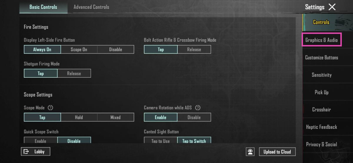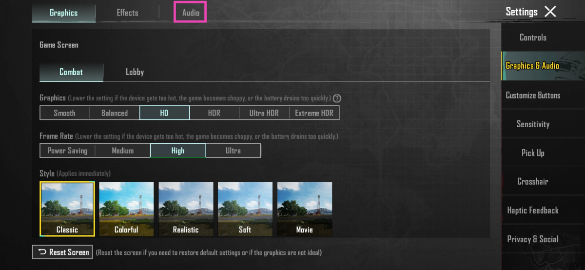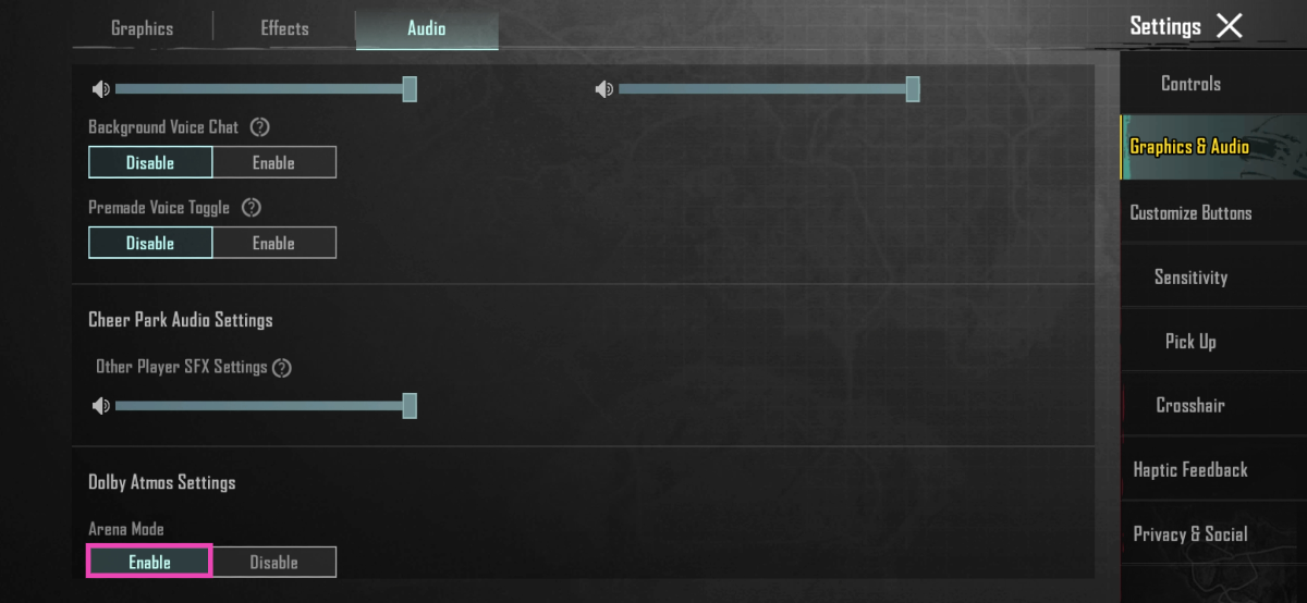 BGMI'yi Android telefonunuzda başlatın, bir eşleşmeye katılın, ayarlar için dişli simgesine basın, 'grafikler ve ses' üzerine dokunun, Ses sekmesine geçin ve Dolby Atmos altında 'Etkinleştir'e basın.