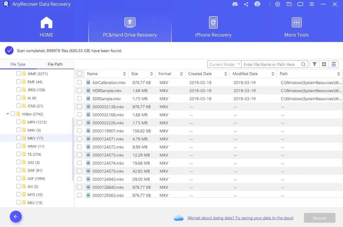 1000'den fazla veri türünde verileri kurtarmanıza izin verir