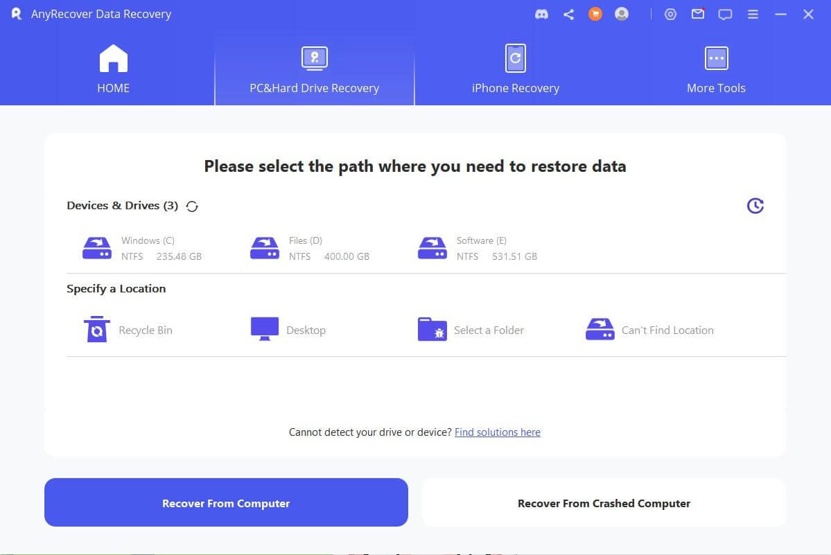 AnyRecover'ın resmi web sayfasına atlayın ve daha sonra yazılımı yükleyin. Programa başladıktan sonra PC & sabit sürücü kurtarma simgesini seçin. Verileri kurtarmak istediğiniz biçimlendirilmiş veya erişilemez sabit sürücüyü seçin.