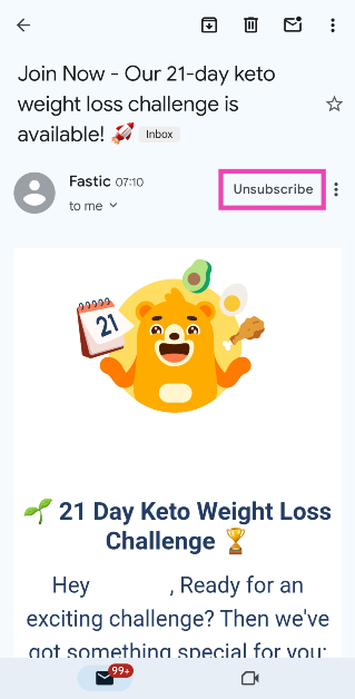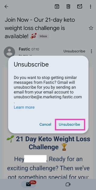 E -postayı açın ve Gmail uygulamasındaki gönderenin adının yanındaki abonelikten çıkma düğmesine basın. Bu düğmeyi bulamıyorsanız, sayfanın altına kaydırın ve abonelikten çıkın.