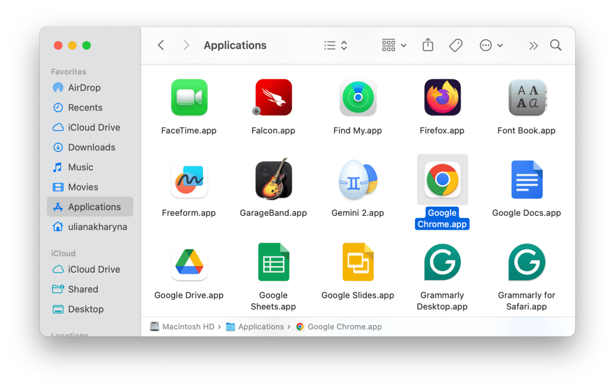 Yani, ilk adım kromu kaldırmaktır. Uygulama klasörünüze gidin ve çöp kutusuna sürükleyin.