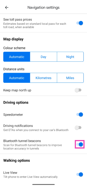 Gidip gelmekProfil> Ayarlar> Gezinme Ayarlarıve Bluetooth Tüneli Beacons için geçiş anahtarını açın.