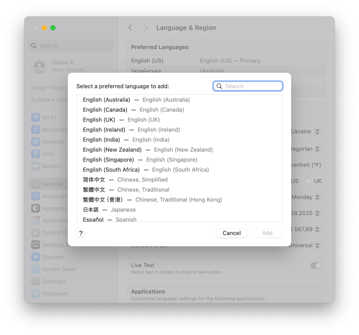 - İstediğiniz dil listede değilse, '+''yı tıklayın ve listeden seçin. Ekle'yi tıklayın.