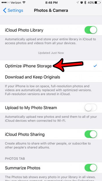Adım 3: Sağdaki düğmeye dokununFotoğraf depolamasını optimize etetkinleştirmek için.