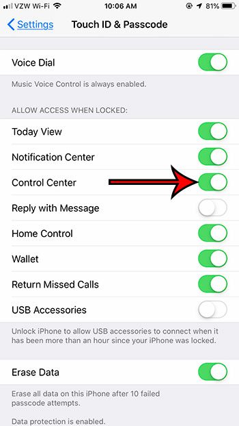 4. Adım: aşağı doğru kaydırınKilitlendiğinde erişime izin verinBölüm, ardından sağındaki düğmeye dokununKontrol merkezi.