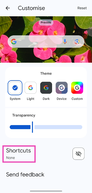 Arama widget'ı için özelleştirme sayfasına gittiğinizde, kısayol için 9 seçenek alırsınız: