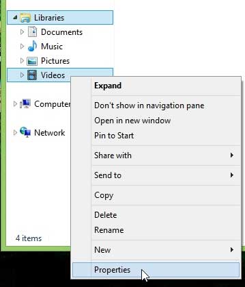 2. Adım: Sağ tıklayınVideolarSeçenek AltındaKütüphanelerPencerenin sol tarafında, ardından tıklayınÖzellikler.