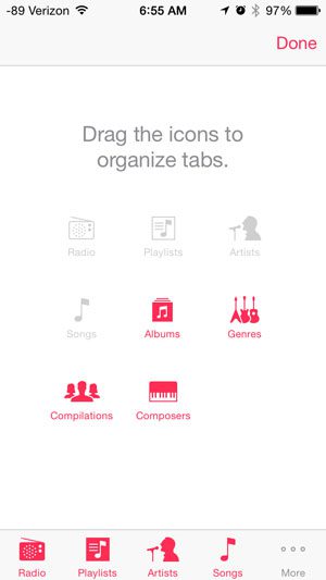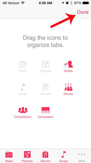 Müzik uygulamasının altındaki maksimum sekme sayısı beştir. Bu nedenle, mevcut bir simgeyi albüm simgesiyle değiştirmeniz gerekecektir. Sanatçılar sekmesini aşağıdaki adımlarda değiştireceğiz, ancak istediğiniz herhangi bir sekmeyi değiştirebilirsiniz.