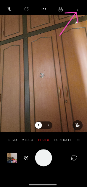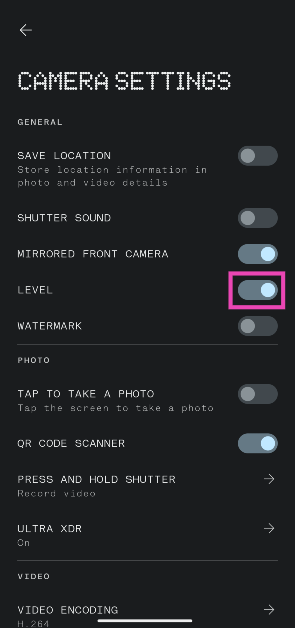 Kamera uygulamasını açın, ekranın sağ üst köşesindeki Ellips/Hamburger menüsüne dokunun, ızgara çizgileri için ON Switch'e basın, 'daha fazla ayar' üzerine dokunun ve 'seviye' için geçiş anahtarını açın.