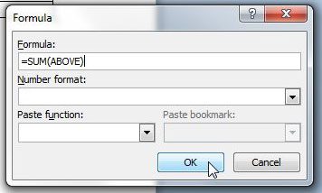 Adım 5: Formül alanındaki formülün diyor ki= Toplam (yukarıda)sonra tıklayınTAMAMdüğme. Toplamı yüzde veya para birimi olarak görüntülemek istiyorsanız,Sayı biçimiaçılır menü ve uygun biçimi seçin.