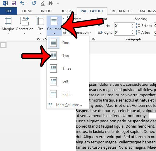 4. Adım: tıklayınSütunlariçindeki düğmeSayfa kurulumuŞeridin bölümü, ardındanİkiseçenek.