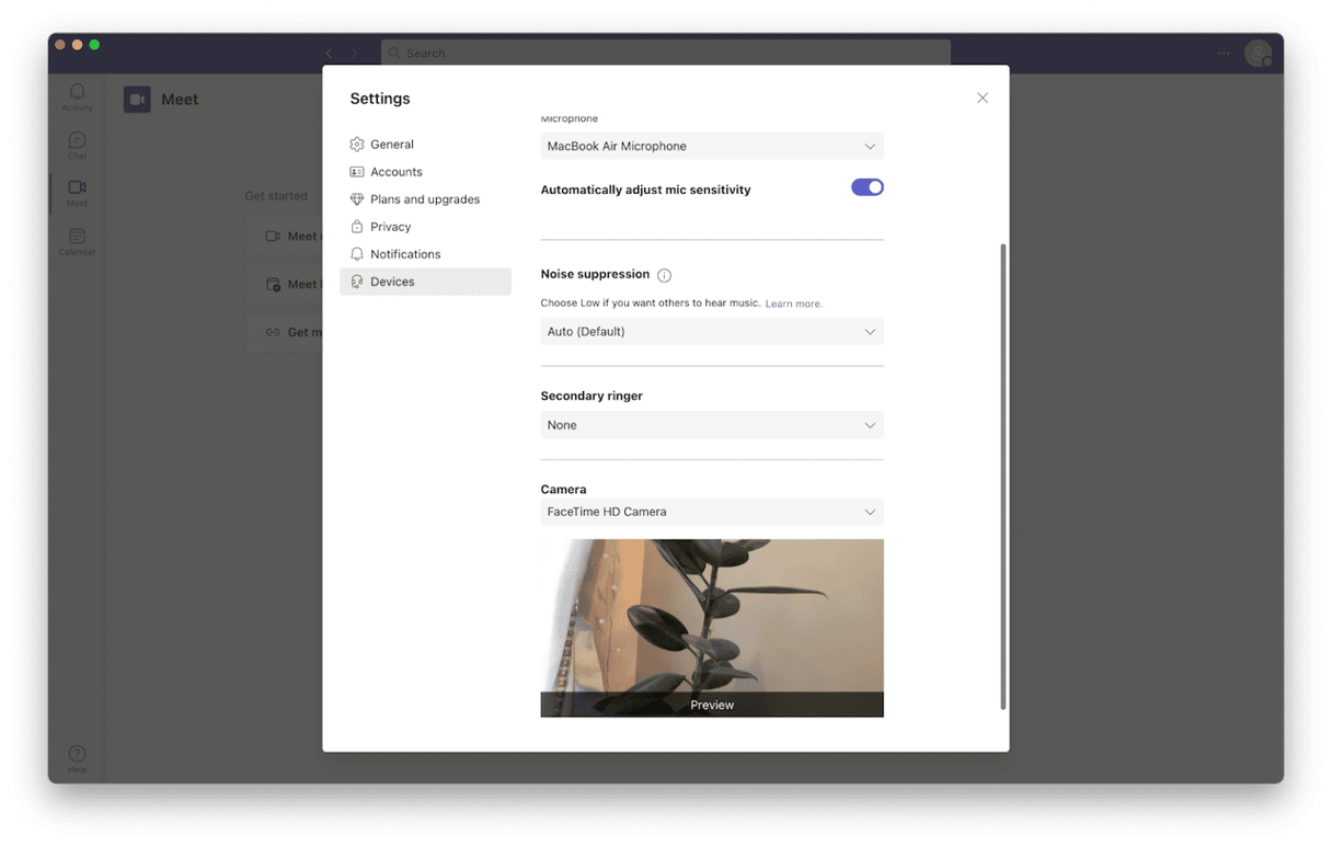 Mac'inize bağlı birden fazla kameranız varsa-belki de yerleşik FaceTime kamerası ve bir USB web kamerası-hangisini kullanacağınızı seçmek isteyeceksiniz. Zoom ve ekipler de dahil olmak üzere çoğu uygulama, video ve ses için bir bölümle birlikte gelen ayar kontrollerine sahiptir. Burada, kullanmak istediğiniz kamerayı ve mikrofonu seçebilir ve genellikle test edebilirsiniz. Bu ayarları, kameranın konumunu istediğiniz yere işaret edecek şekilde ayarlamanıza yardımcı olmak için de kullanabilirsiniz, çünkü görüntünün bir önizlemesini gösterir.