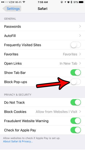 Adım 3: Aşağı kaydırın ve sağındaki düğmeye dokununBlok Pop-up'ları. Pop-up'ların gelmesine izin vermek için düğmenin sol pozisyonda olması gerektiğini unutmayın. Aşağıdaki resimde pop-up'lara izin veriyorum. Pop-up'ları tekrar engellemek isterseniz her zaman buraya daha sonra geri dönebilir ve bu ayarı değiştirebilirsiniz.